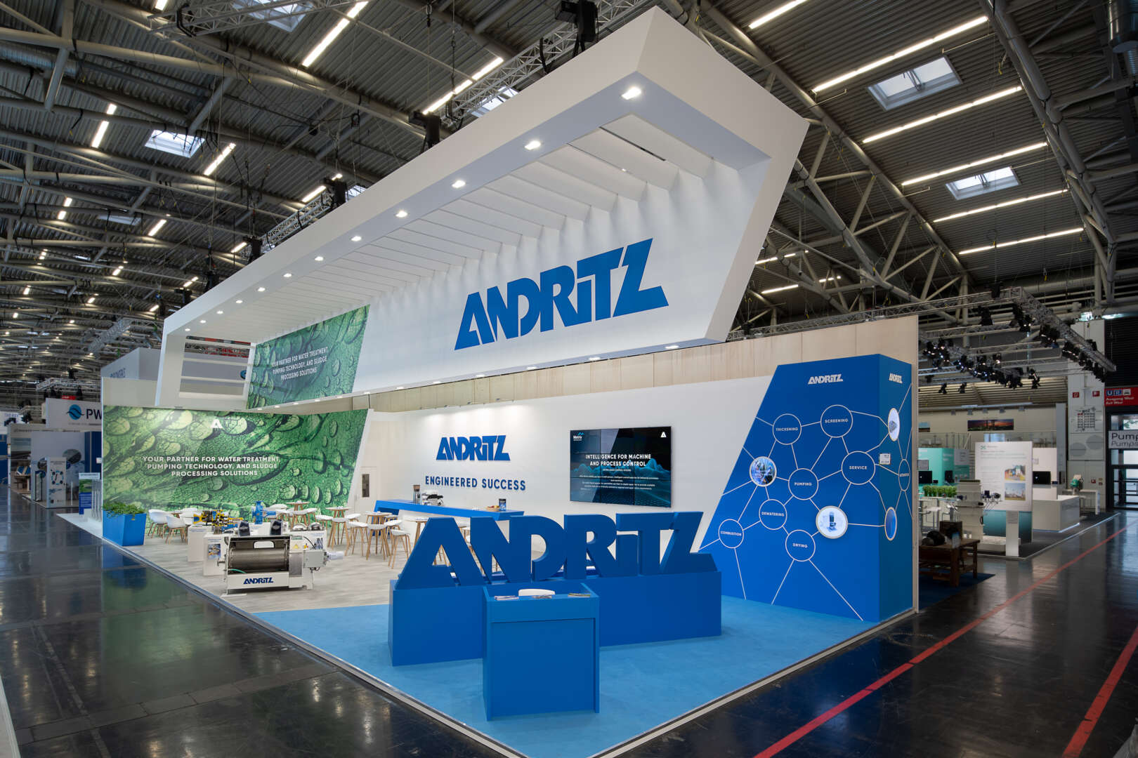 Het ontwerp van de stand was modern, open, licht en fris. Een enorme hangende eyecatcher trok de aandacht, terwijl de open opstelling uitnodigend was. Er is een ontmoetingsruimte gecreëerd, waar bezoekers en vertegenwoordigers van ANDRITZ elkaar konden spreken. De afstemming van het juiste printwerk en het kleurgebruik zorgt voor samenhang in het geheel.