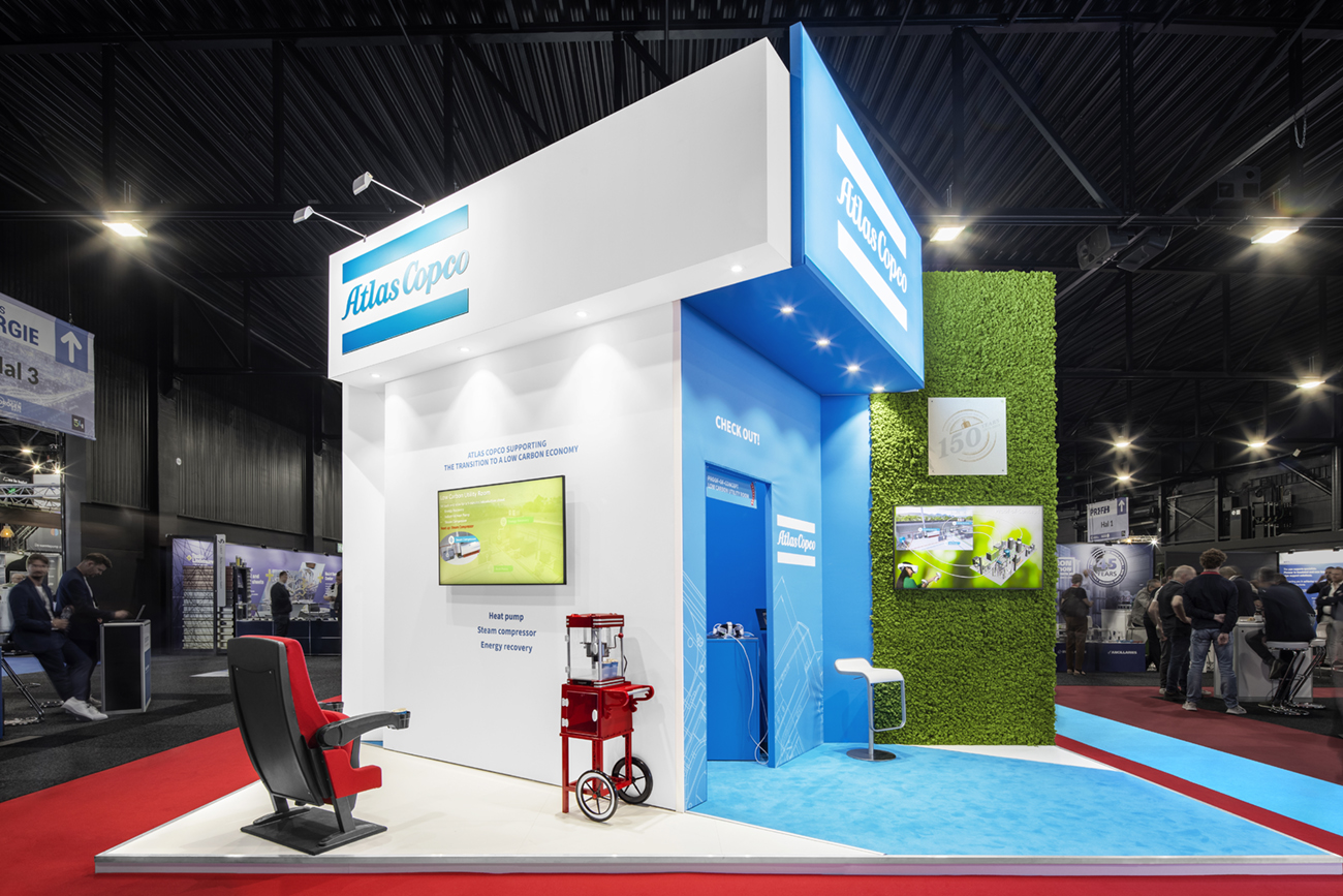 Een van de stands was voorzien van een nagebootste utility room die bezoekers een kijkje bood in de processen van Atlas Copco. Verschillende units werden zorgvuldig gepresenteerd en kregen volop de aandacht.