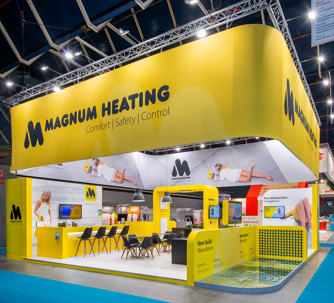 De Magnum huisstijl kleur geel voert de boventoon op deze ruime open eilandstand. Ruimte om klanten te ontvangen en het nieuwe slimme WiFi MAGNUM Remote Control System te tonen is er volop. Opvallen, producten tonen, klanten ontvangen, deze modulaire stand ziet u op meerdere vakbeurzen terug.