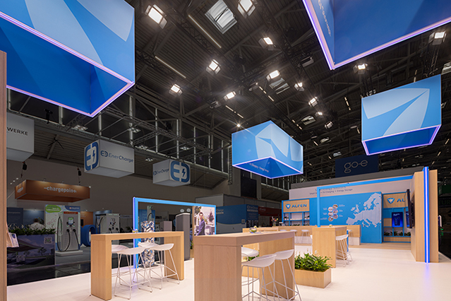 Bezoekers werden aangetrokken door het uitnodigende ontwerp dat gericht was op interactie en betrokkenheid. De strakke witte laminaat vloer gaf de stand een moderne en professionele uitstraling, terwijl blauwe LED-lijnen en verlichting een futuristisch element toevoegden. Onze ontwerpbenadering zorgde voor een toegankelijke en open sfeer. Daarnaast creëerden we unieke elementen zoals hangende LED-kubussen en display panelen met het Alfen-logo gemaakt van mos. Deze accenten gaven de stands een onderscheidende en milieuvriendelijke uitstraling, die perfect paste bij Alfen's innovatieve producten.