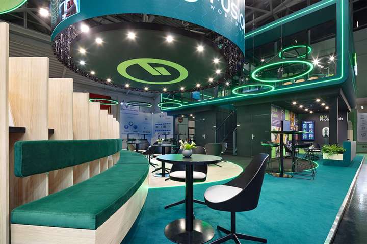De beursstand was een statement an sich. De enorme, hangende cirkelvormige banners, met LED verlicht in de merkidentiteit van Fusion Worldwide, trokken bezoekers van veraf aan.